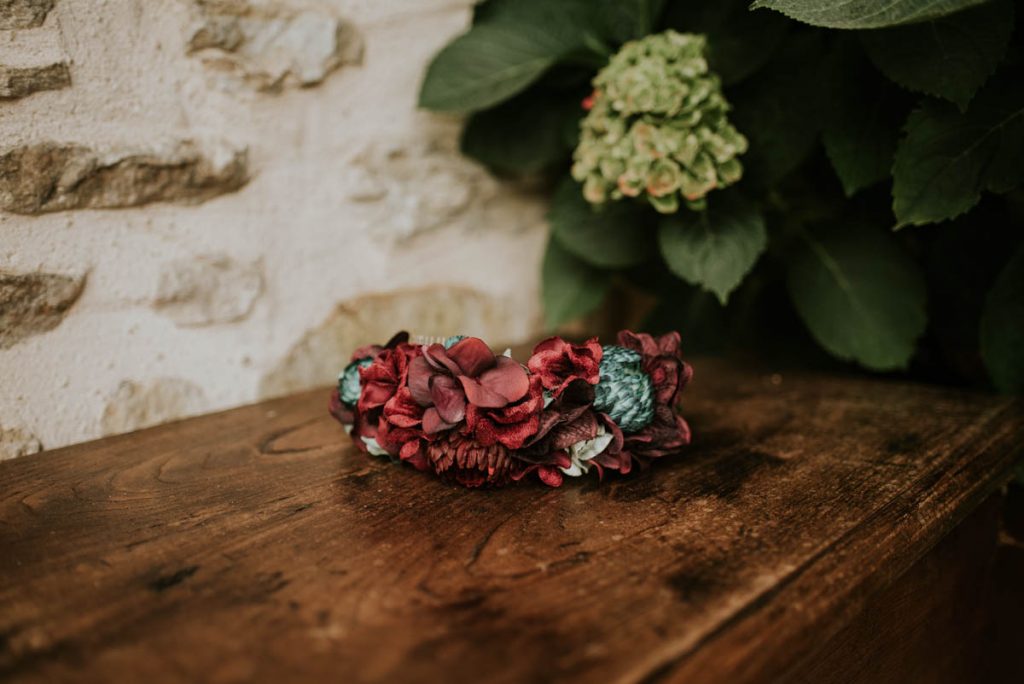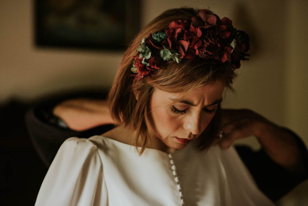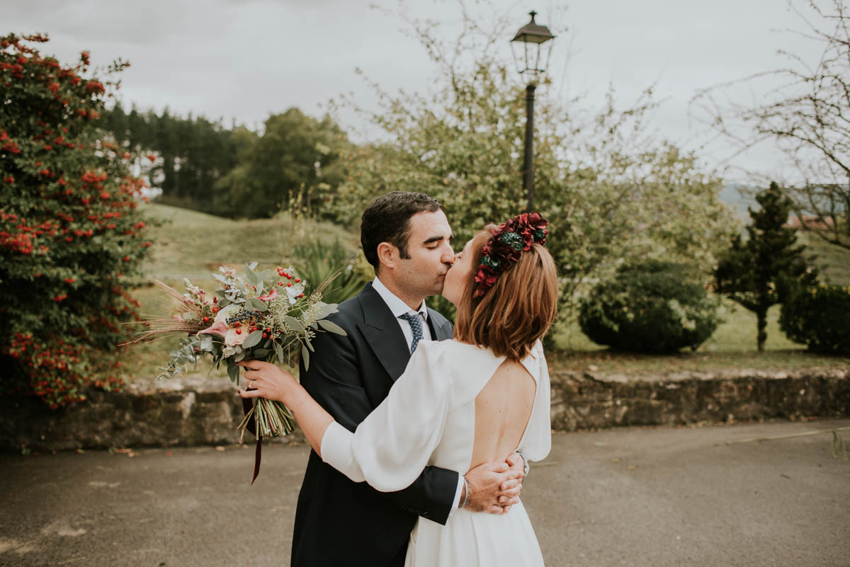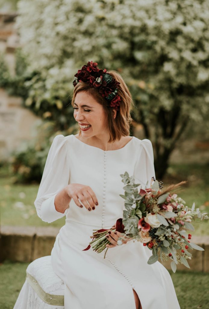 El ramo de novia era una preciosa composición de Margarita me llaman en tonos verdes y granates, a juego con el tocado y con el maquillaje de la novia, obra de Bobbi Brown, que destacó sus labios en un tono cereza realzando la belleza de Amaia.